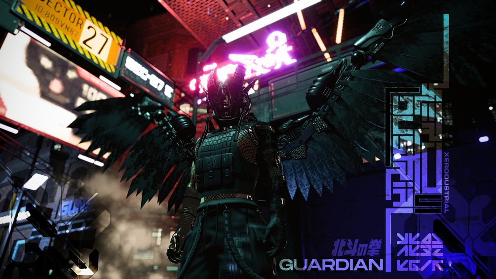 Guardian 3.0 is a Cyberpunk 2077 inspired Avatar with the idea in mind that he would be some sort of Arasaka Bodyguard or Agent of sorts if he were to exist in the Cyberpunk Universe